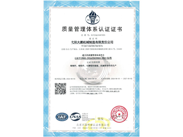 公司順利通過質(zhì)量管理體系認證、環(huán)境體系認證、職業(yè)健康安全管理體系認證、環(huán)評。2015年5月獲國家工信委頒發(fā)的《鑄造企業(yè)準(zhǔn)入條件》;2019年做了安全現(xiàn)狀評價;2020年取得了排污許可證。